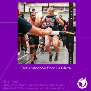 Ferris Sandboe is the reigning Canadian Strong Woman Champion in the U73kg division. She qualified for the Natural World’s Strongest Women in Scotland and Arnold Schwarzenegger Sports Festival in Ohio.